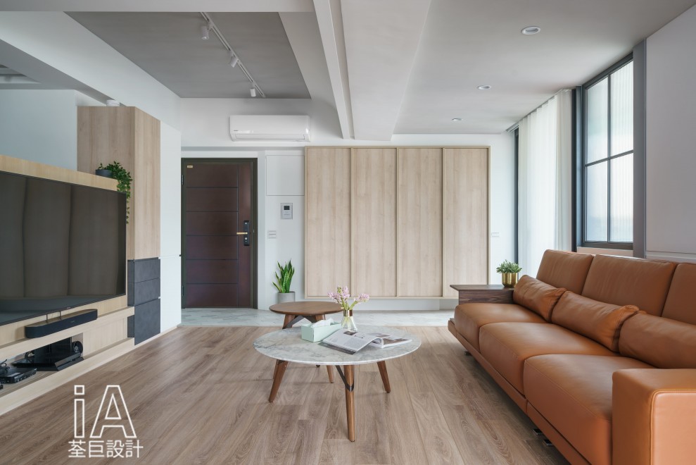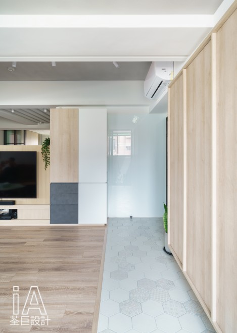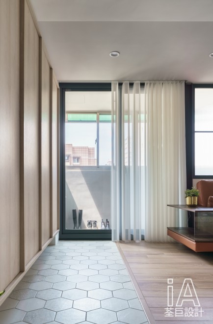 推開大門即見寬敞的客廳,玄關左側以整排的懸吊式櫃體作為入門收納區;地面六角花磚到直向鋪設的木地板界定了場域。