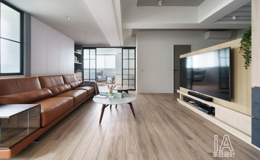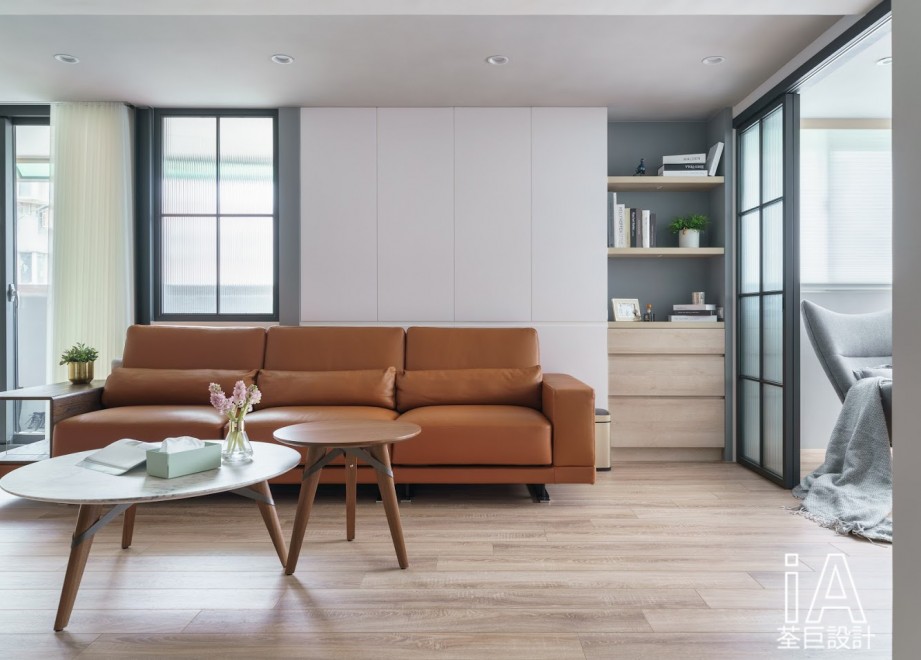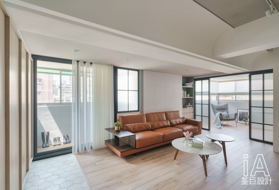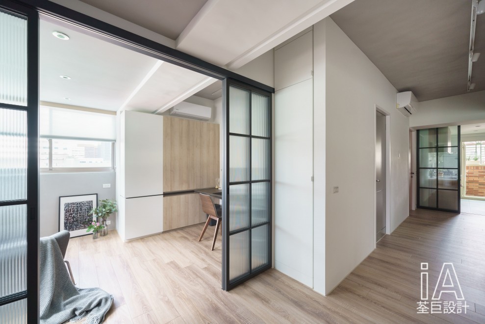 客廳的端景是專屬夫妻倆的陽光秘境,是辦公室也是私人休憩區,長虹玻璃滑軌拉門讓隱私更有彈性。