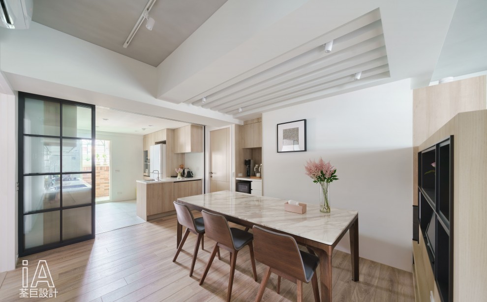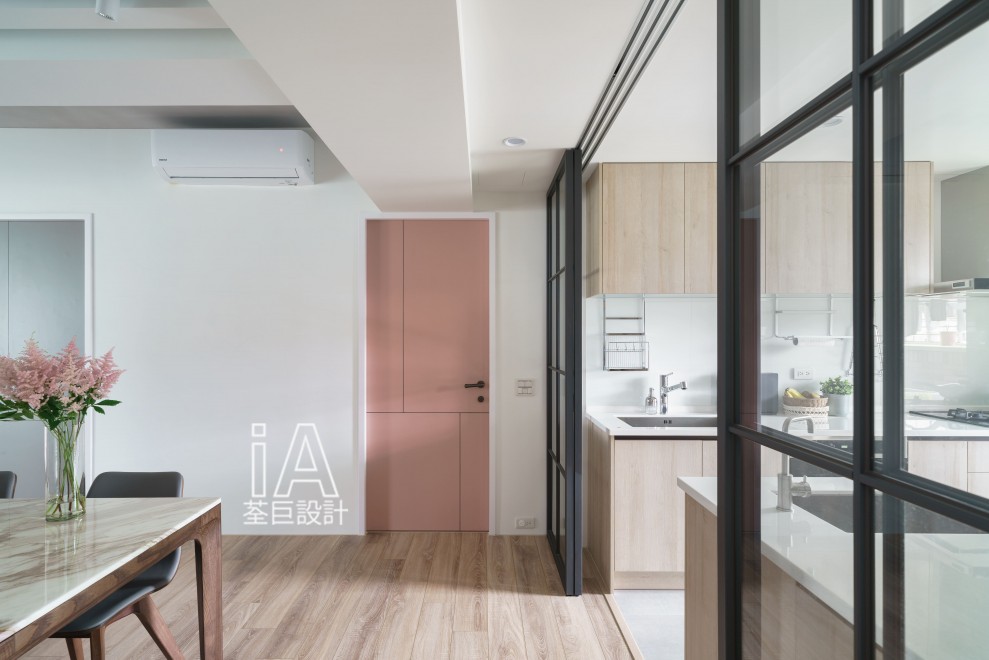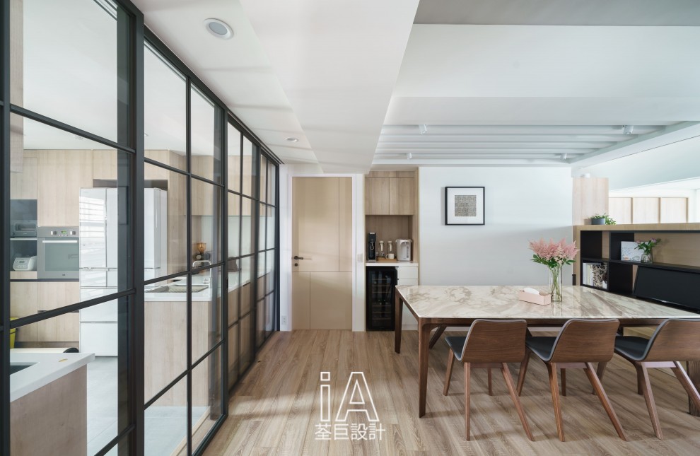 開放式廚房一樣用玻璃拉門區隔空間,炒菜燉煮時可以阻隔油煙,完全敞開則變成陽光廚房,方便招待親友、來場陽光午茶共享週末假期。