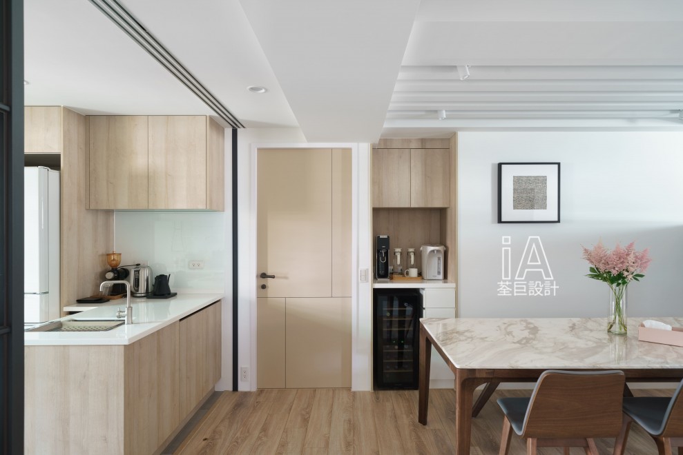 餐廚區域牆面的畸零空間設計成擺放咖啡機與酒櫃的小吧台。