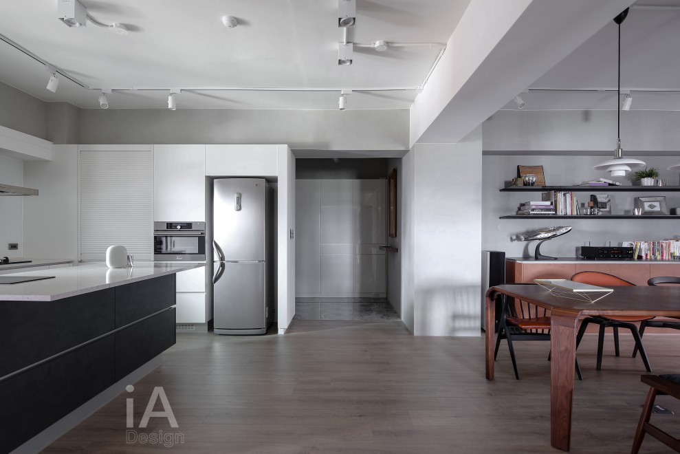 而廚房則呈開放式規劃,搭佐中島式吧檯設計,網羅齊全的收納機能;