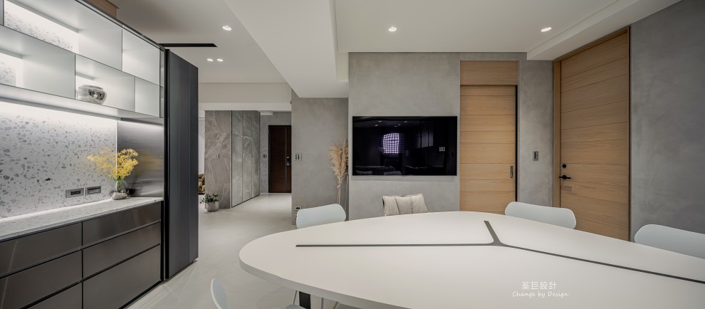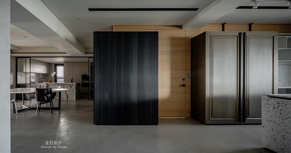 64坪的空間,簡單又饒富藝趣,從玄關開始,楊禾聿設計師使用了落地式收納櫃體,