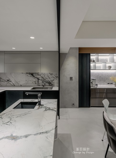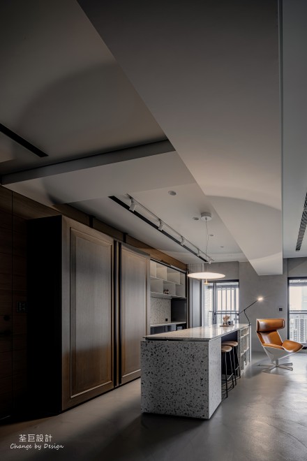 開放式的公共區域水磨石中島,提供屋主全家人閱讀和學習的地方,同時可變身為吧檯功能,