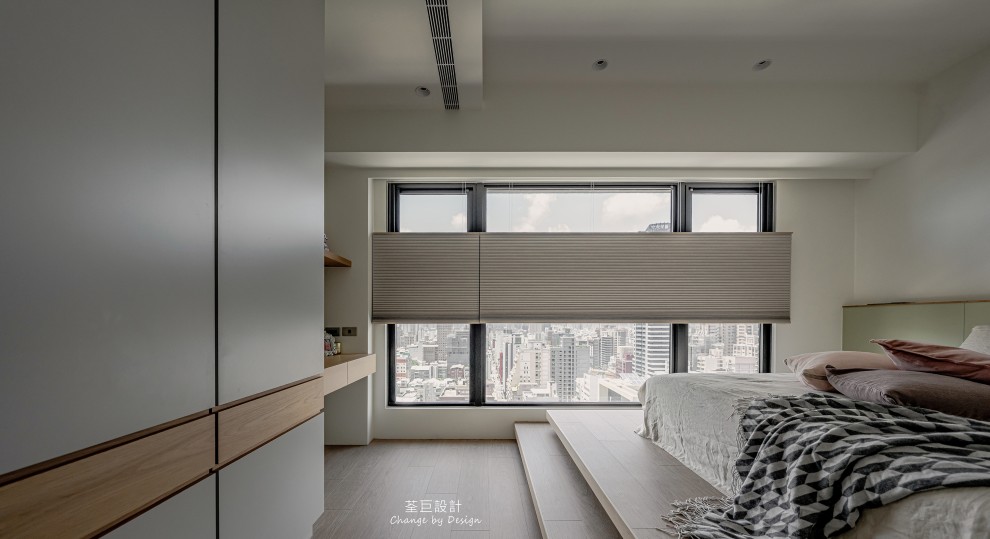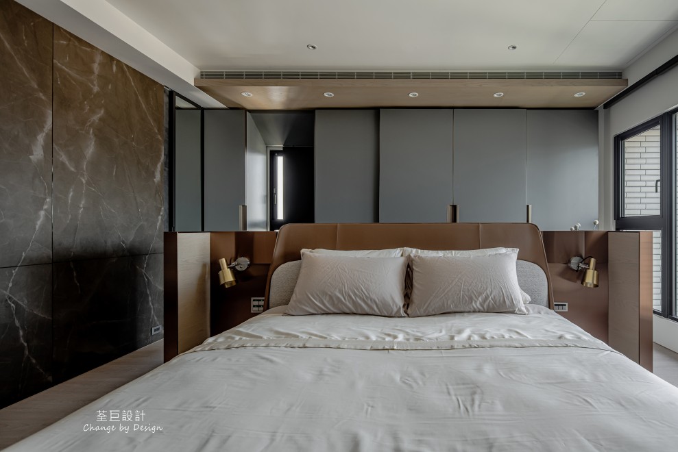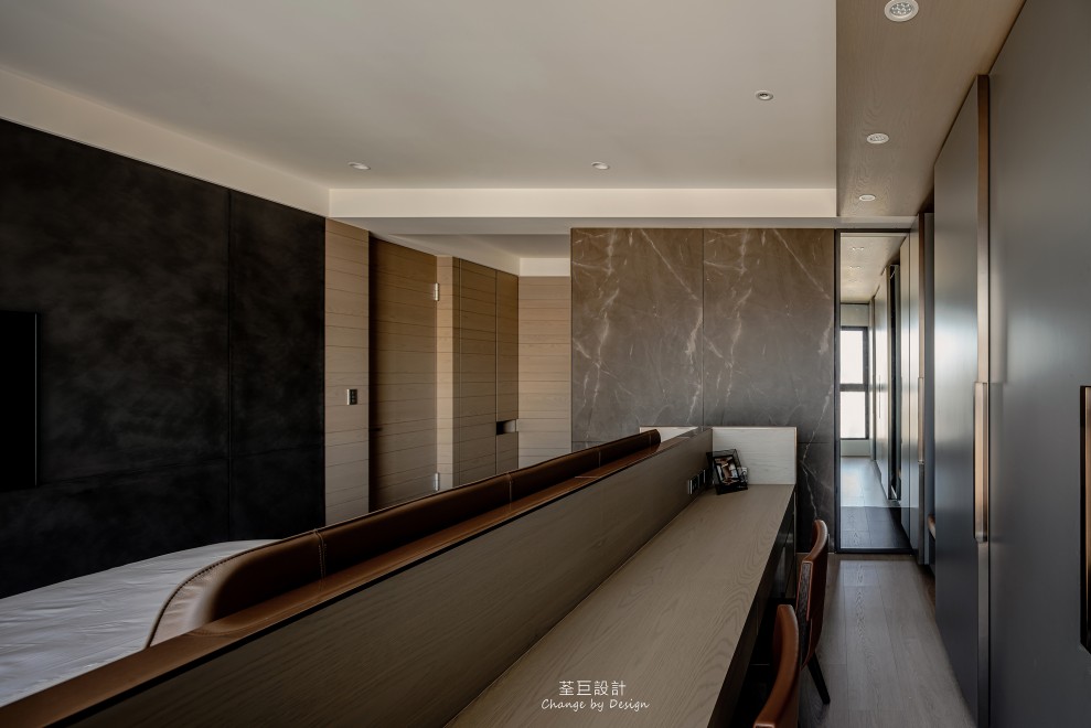 主臥室中,設計師將櫃子移至床頭的背後,巧妙地遮住了令人感到壓迫的大樑,並在中間走道中安放了書桌,使空間兼具美感及實用性!