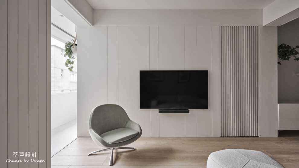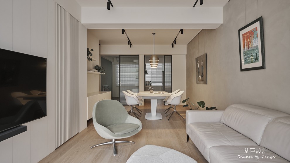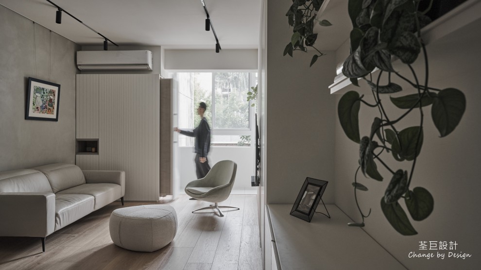 玄關鞋櫃被巧妙地隱於門邊,不佔用過多的空間。客廳使用水泥漆以輕淺色調建構出層次感,並以鐵件點綴,營造出清爽整潔的立面。