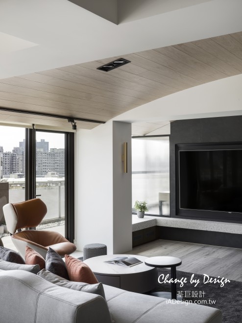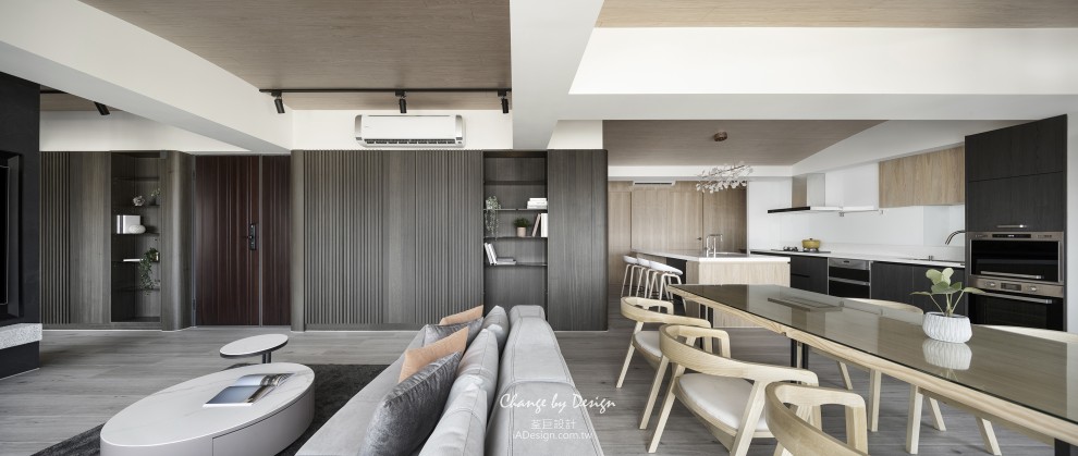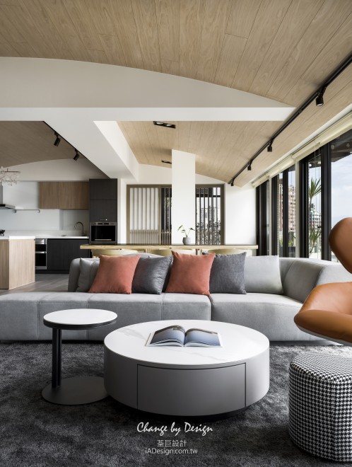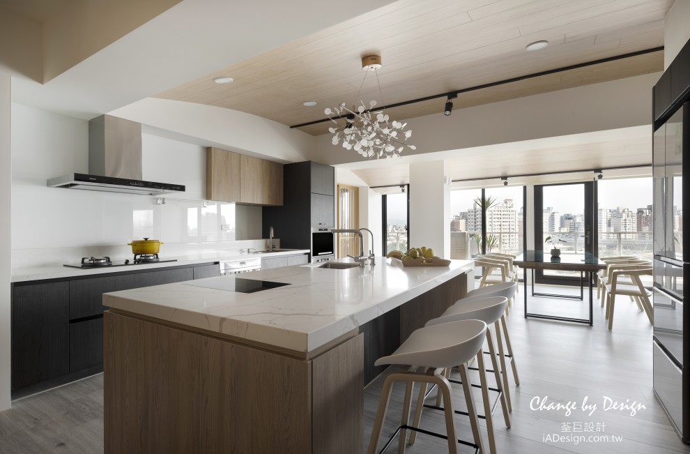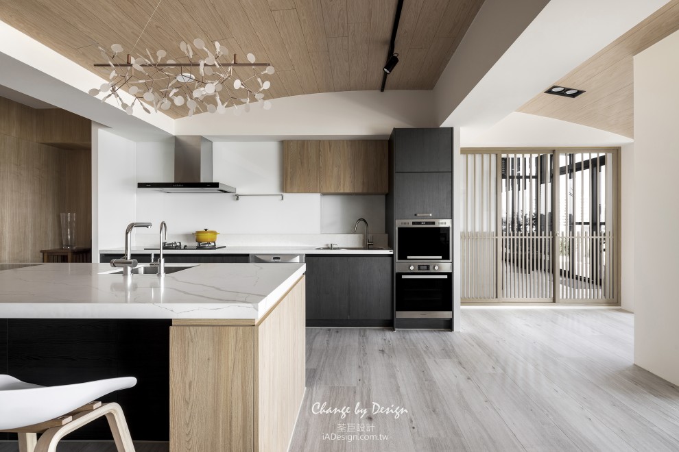 大樑採用曲線設計增加了視覺趣味,提升了室內高度感。 廚房的設計更是貼心,中島和各種收納和儲物空間的設置,讓廚房的空間更具流暢性和實用性,同時增加了動線和檯面空間。