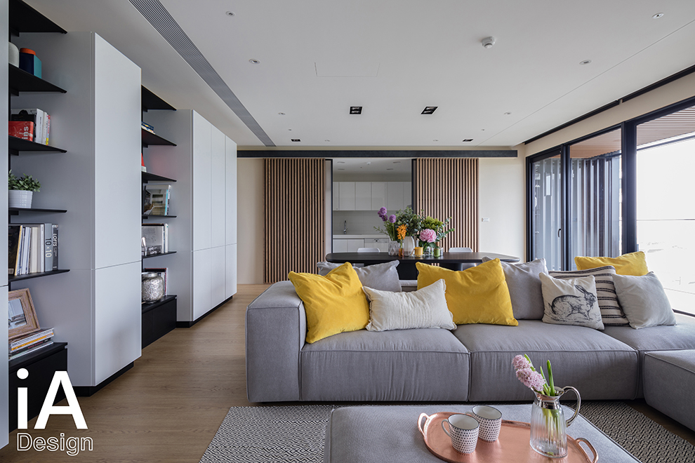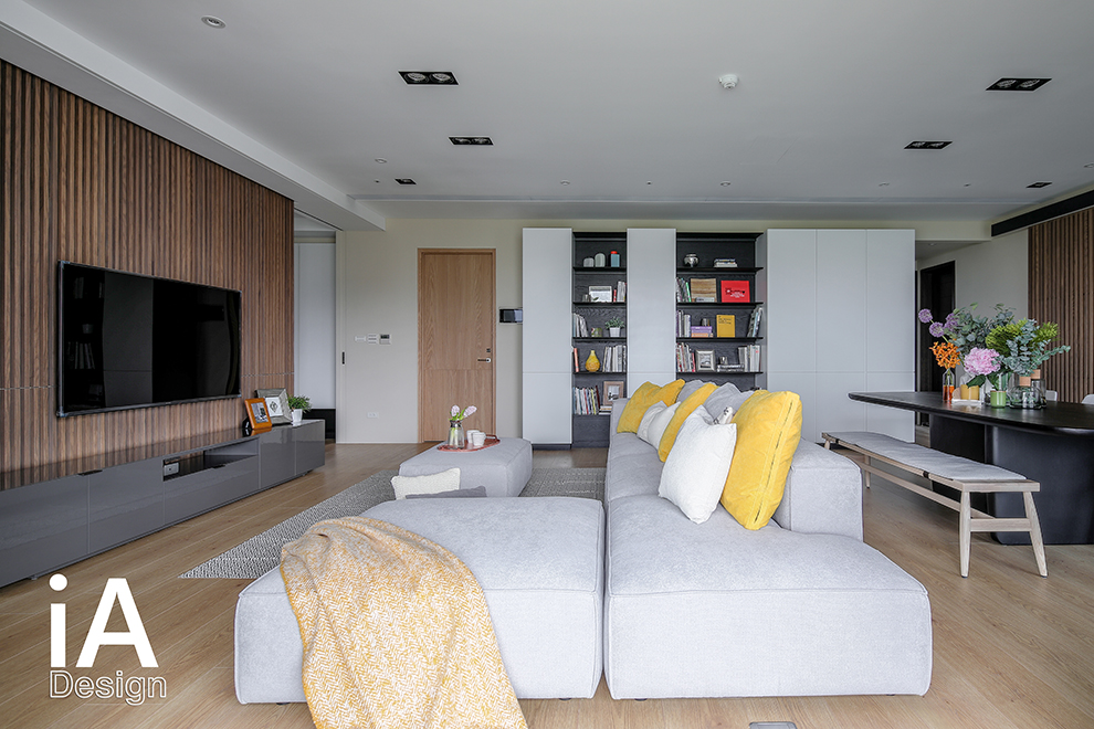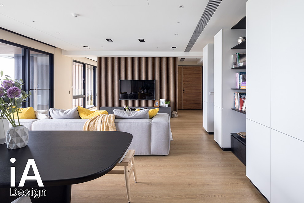 全室透過白色、淺灰建構基底,並給予開放式格局規劃,延伸視覺上的流暢感,並在電視牆、廚房門片加入垂直木質紋理,巧妙平衡室內溫度,並形成前後景的趣味對話;
