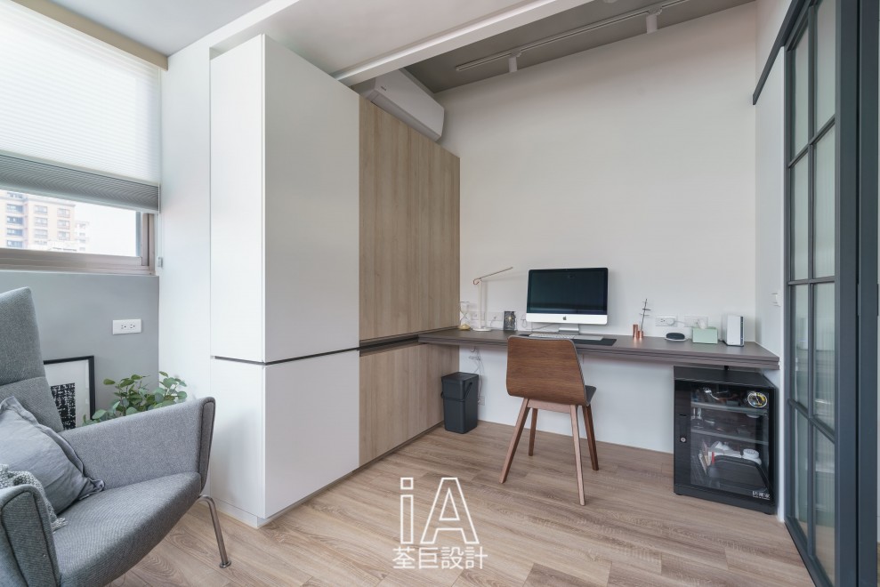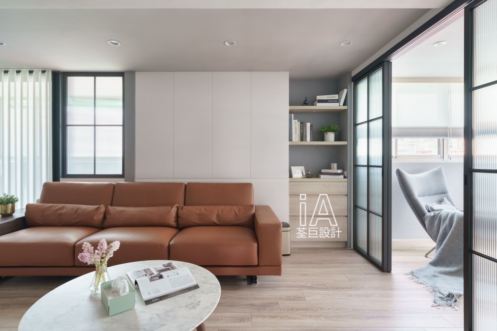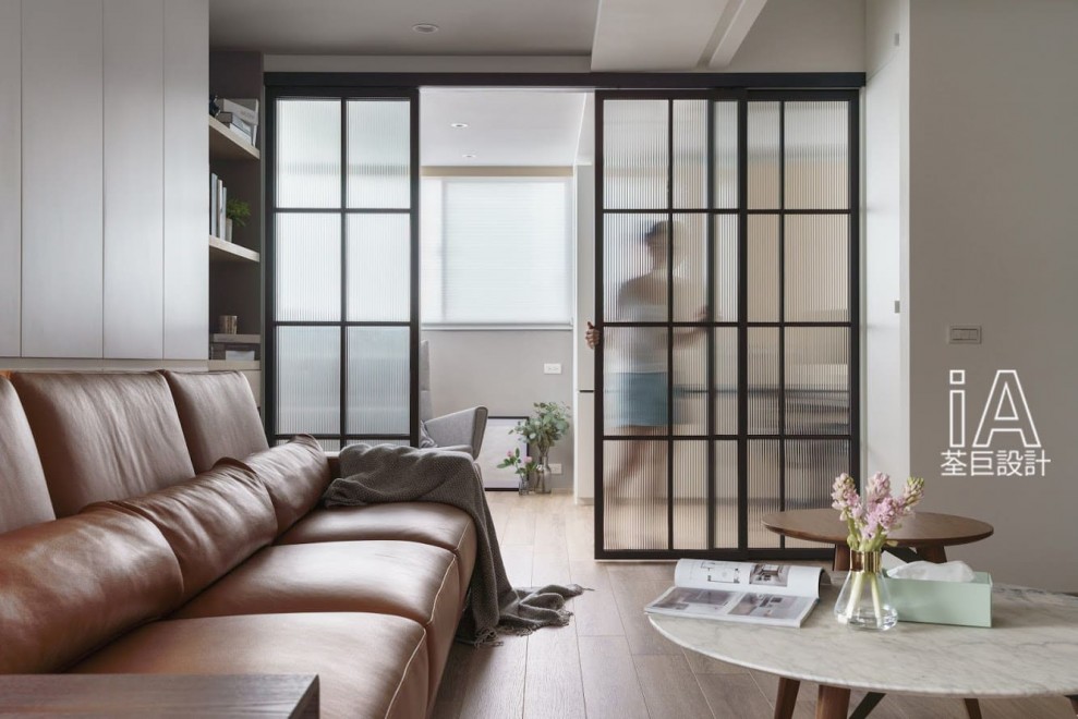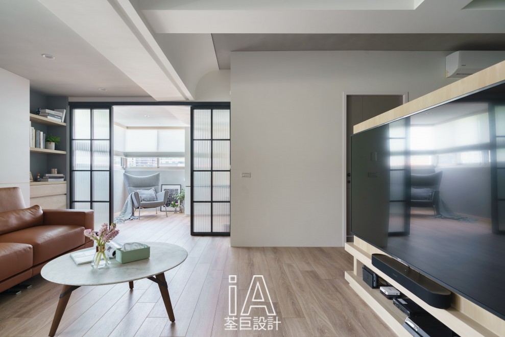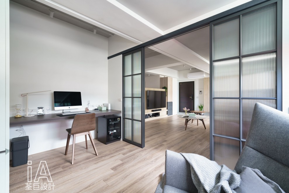 客廳的端景是專屬夫妻倆的陽光秘境,是辦公室也是私人休憩區,長虹玻璃滑軌拉門讓隱私更有彈性。
