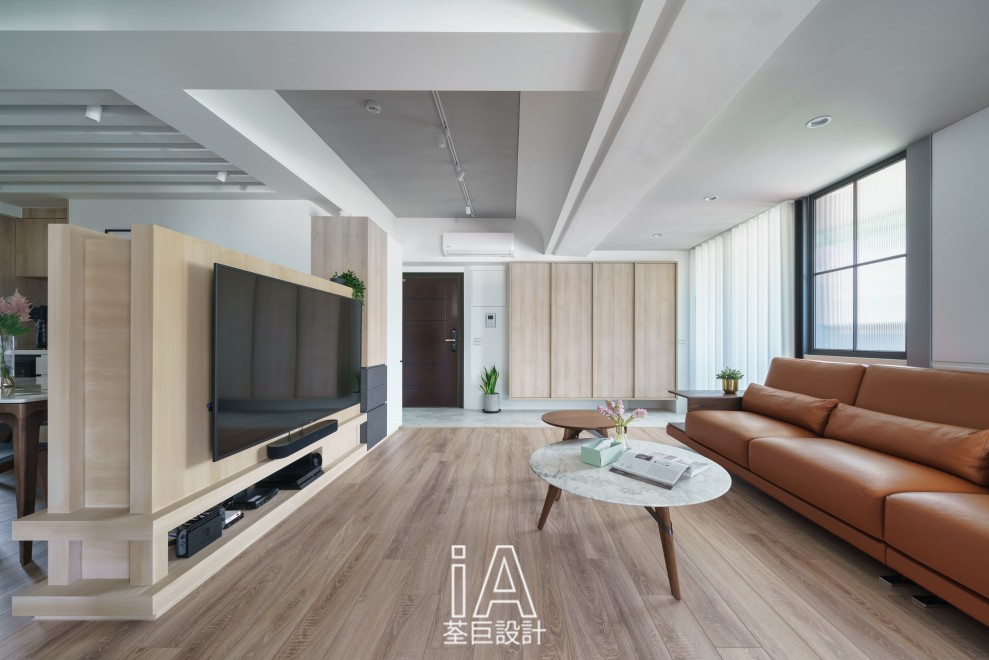 推開大門即見寬敞的客廳,玄關左側以整排的懸吊式櫃體作為入門收納區;地面六角花磚到直向鋪設的木地板界定了場域。