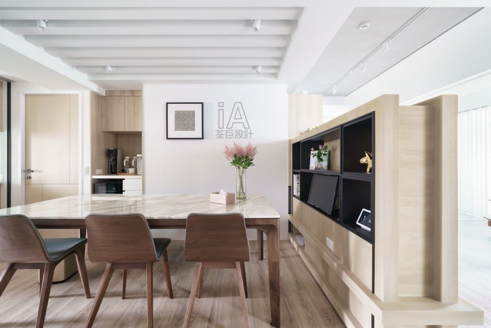 電視矮牆對齊結構柱自然地劃分餐廚界線,電視牆的另一面是溫馨的用餐區;