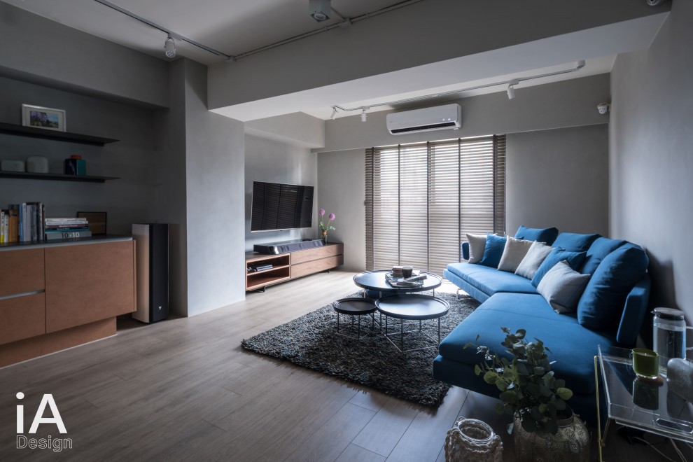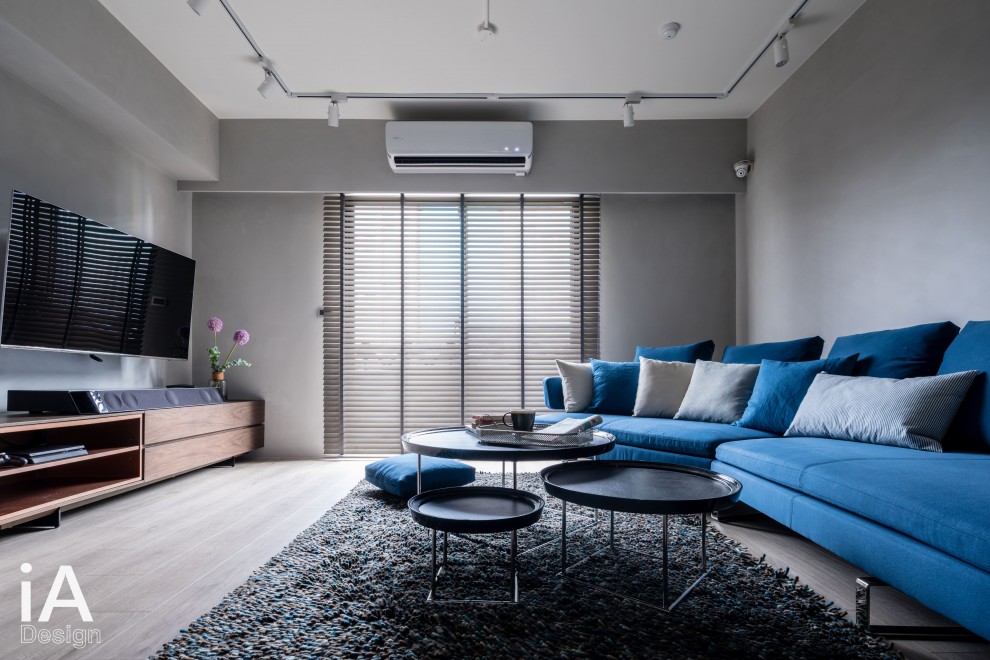 在客廳的整體配置上,選用鮮明的藍色沙發跳出亮點,並巧妙給予ㄑ字形陳列方法,讓視覺更能聚焦在此;