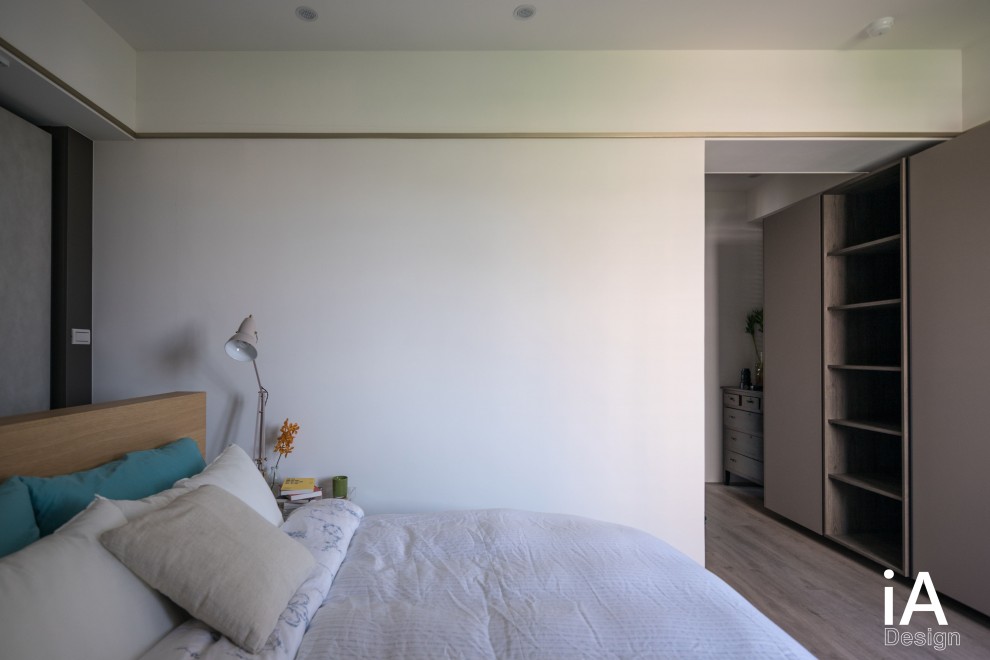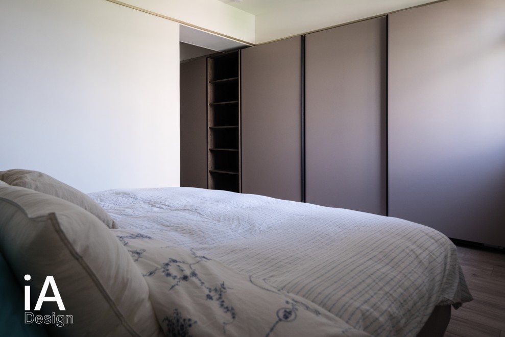 主臥內,運用俐落線條、典雅色彩的妝點,形塑時尚簡約的調性,並同步注入收納與展示功能,使空間兼具美感及實用性!