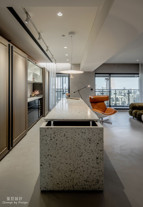 開放式的公共區域水磨石中島,提供屋主全家人閱讀和學習的地方,同時可變身為吧檯功能,