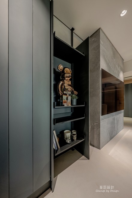 64坪的空間,簡單又饒富藝趣,從玄關開始,楊禾聿設計師使用了落地式收納櫃體,