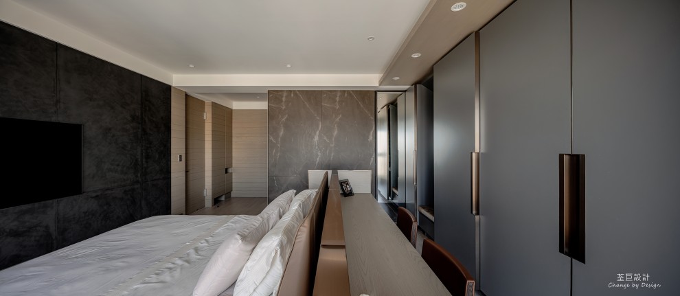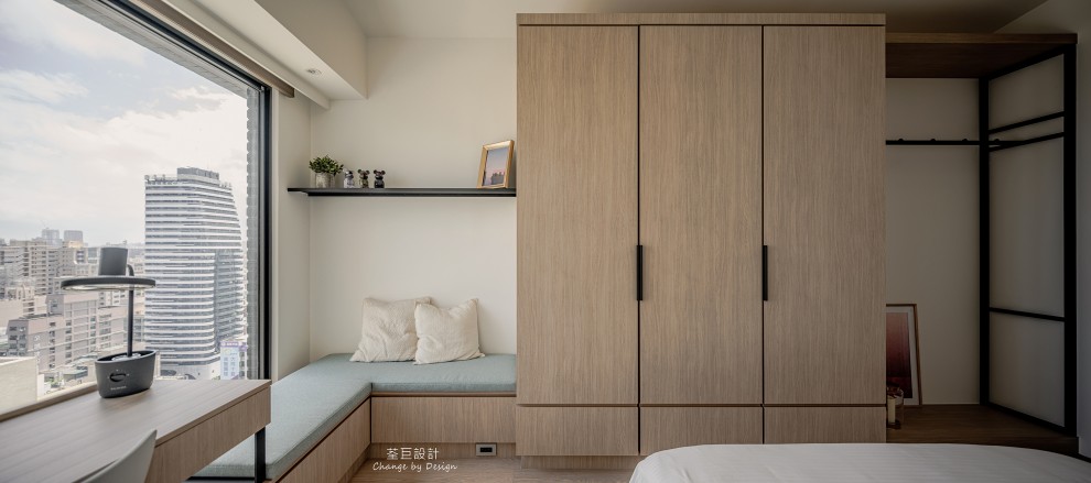 主臥室中,設計師將櫃子移至床頭的背後,巧妙地遮住了令人感到壓迫的大樑,並在中間走道中安放了書桌,使空間兼具美感及實用性!