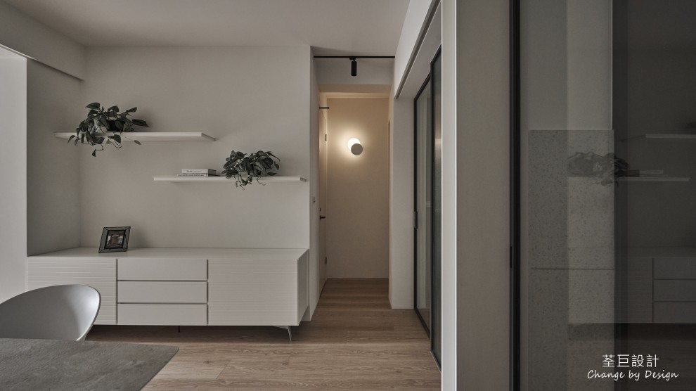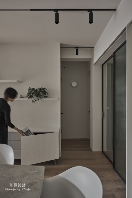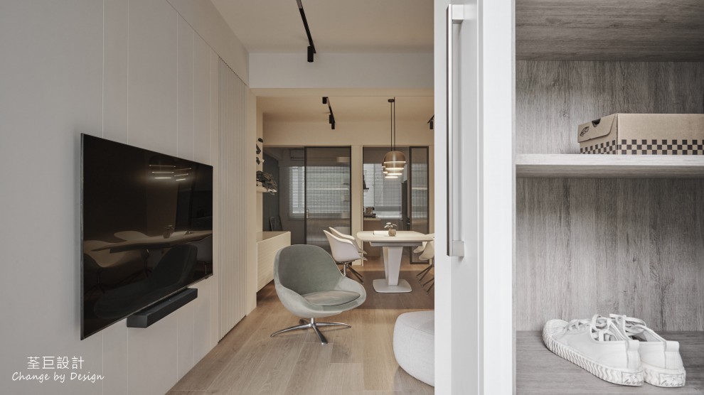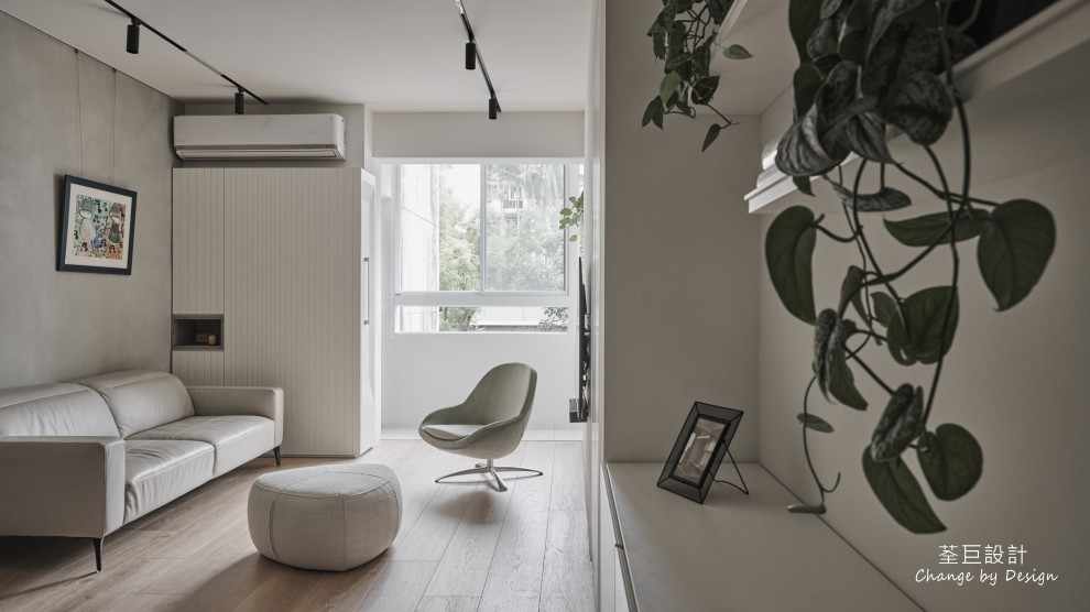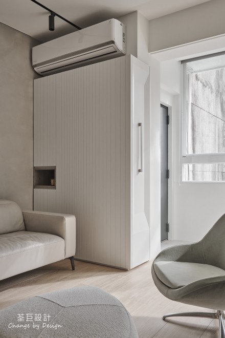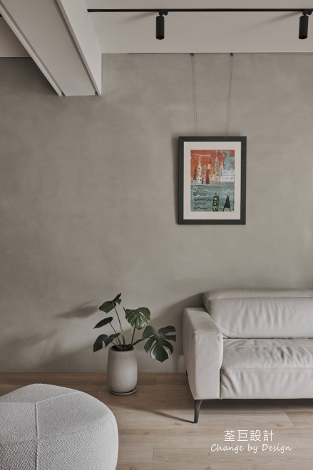 玄關鞋櫃被巧妙地隱於門邊,不佔用過多的空間。客廳使用水泥漆以輕淺色調建構出層次感,並以鐵件點綴,營造出清爽整潔的立面。