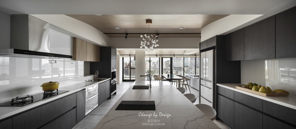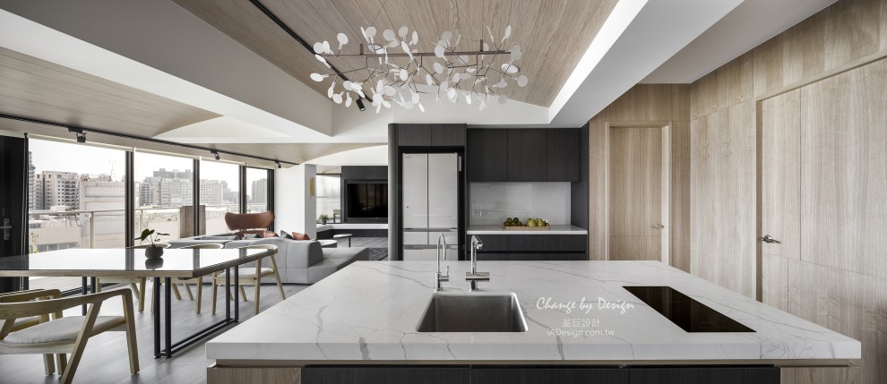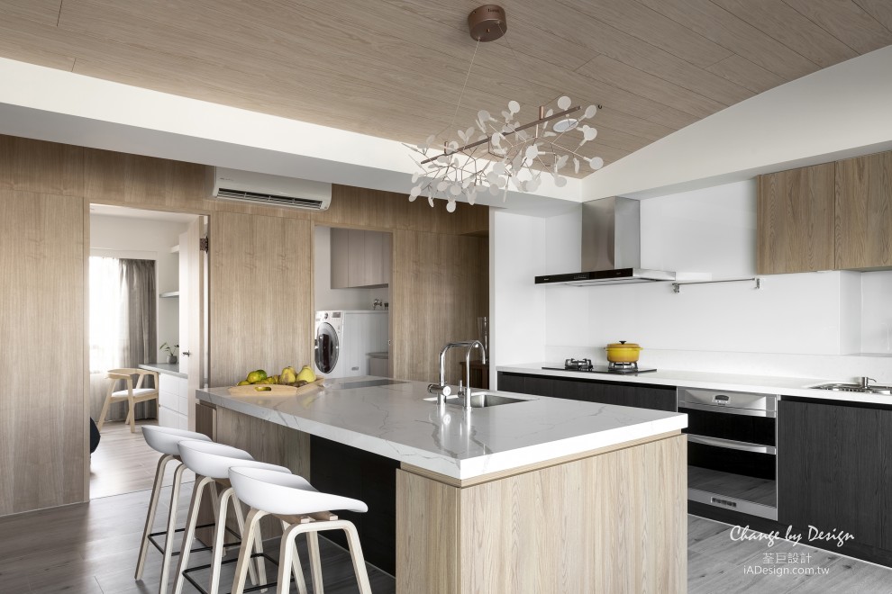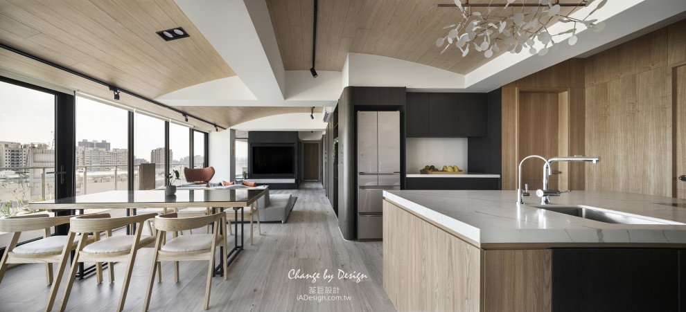 大樑採用曲線設計增加了視覺趣味,提升了室內高度感。 廚房的設計更是貼心,中島和各種收納和儲物空間的設置,讓廚房的空間更具流暢性和實用性,同時增加了動線和檯面空間。